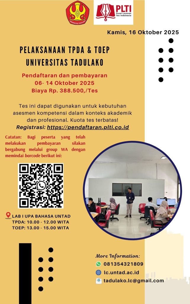 UPA Bahasa Universitas Tadulako bekerja sama dengan PLTI (Pusat Layanan Tes Indonesia) akan melaksanakan Tes Potensi Dasar Akademik (TPDA) dan Tes of English Proficiency (TOEP) pada: